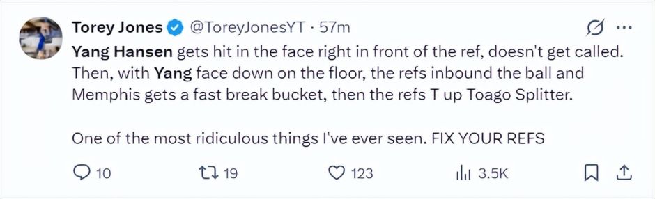 开拓者记者泰勒-琼斯很愤怒,他写道:杨瀚森在裁判的面前被击中面部,但裁判并没有吹罚。随后杨瀚森倒在地上,裁判让灰熊发球快攻,灰熊轻松拿分,裁判又让灰熊换人。这是我见过最荒唐的事情之一。