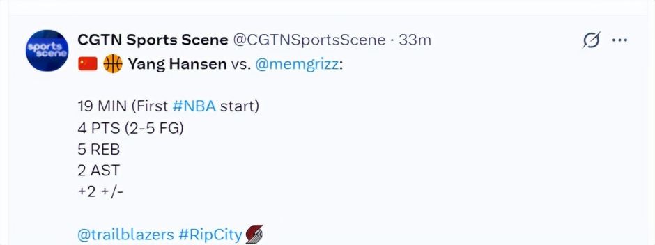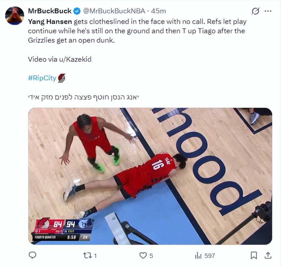 开拓者媒体:杨瀚森在毫无防备的情况下被打到面部,裁判们对此无动于衷还让比赛继续进行,灰熊完成了一次无人防守的扣篮才吹停了比赛。