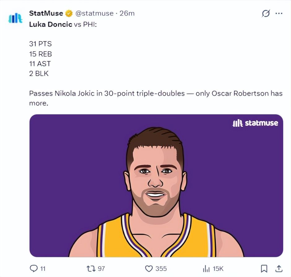 北京时间12月8日,湖人以112-108逆转费城避免连败,湖人也重返西部第二。东契奇无愧现役的天皇巨星,他回家两场比赛复出就能打出完美的表演,他拿到31分15篮板11助攻的超级三双数据,生涯第49次30+三双超越约基奇、威少独享历史第二。
