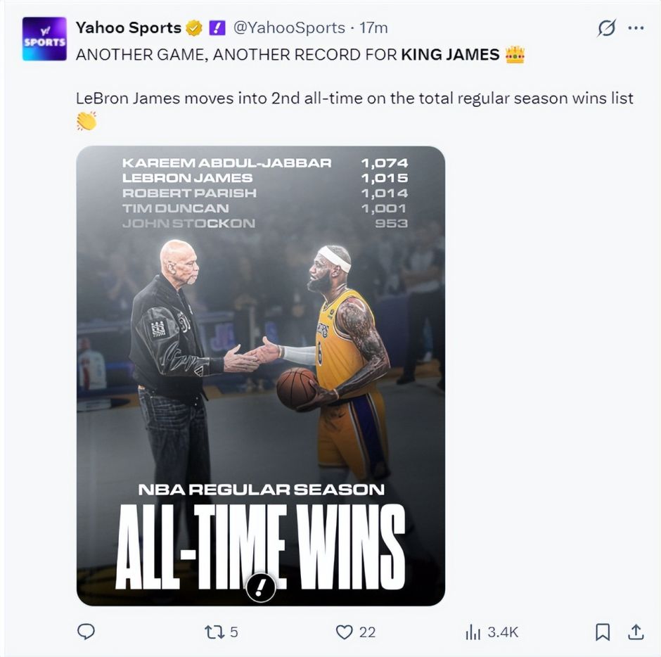 湖媒写道:勒布朗已经进入生涯第23个赛季,我们未来或许再也看不到有这样的球员。