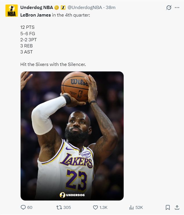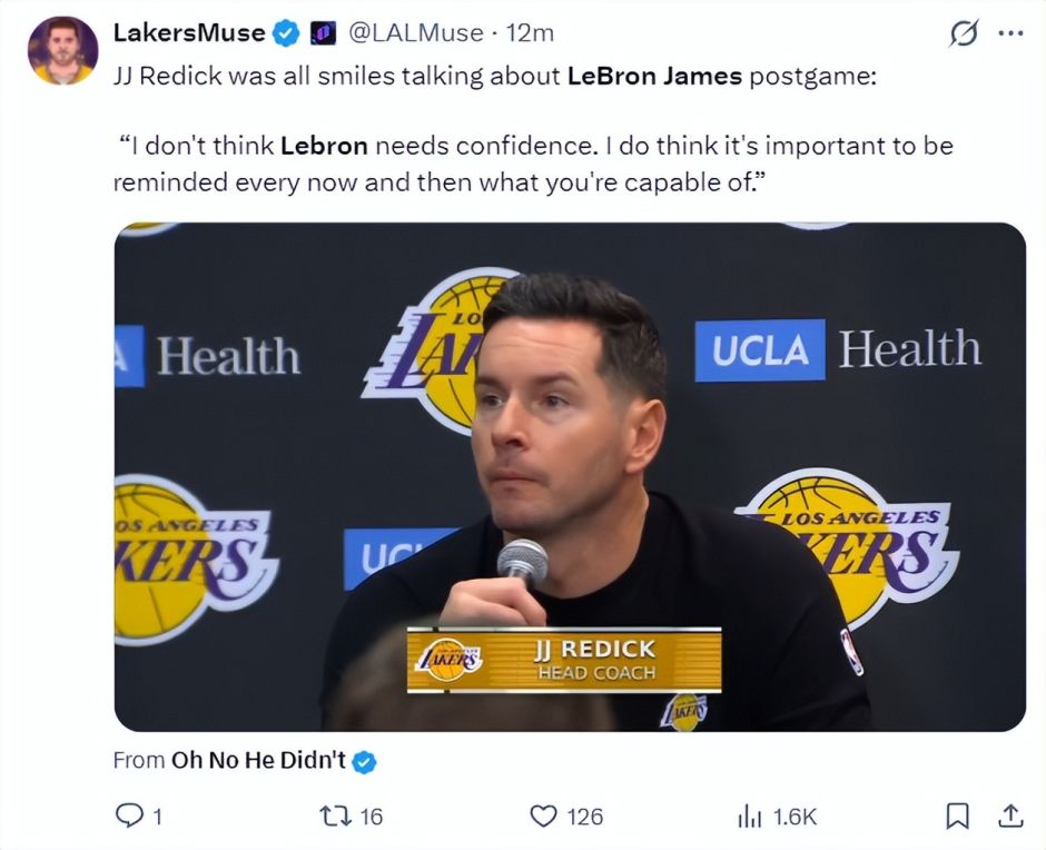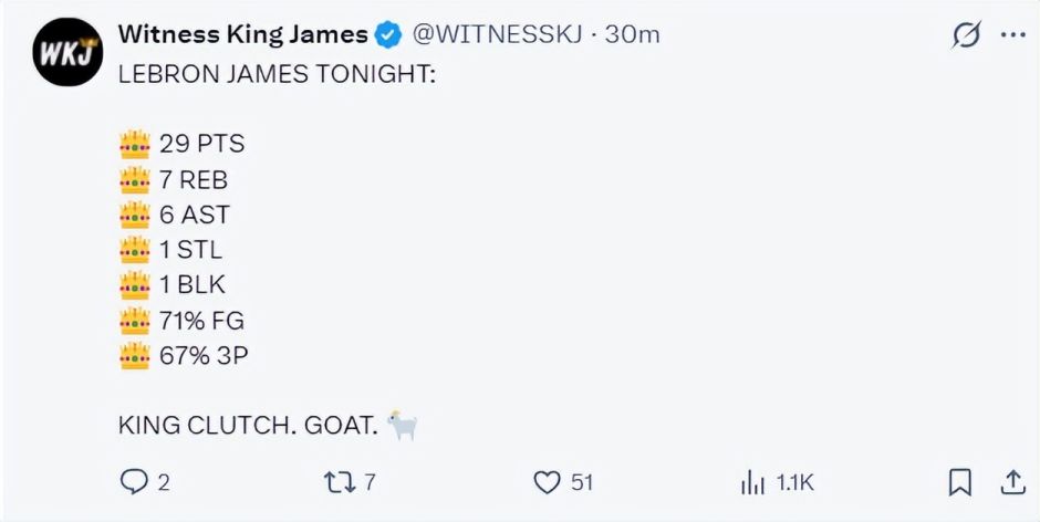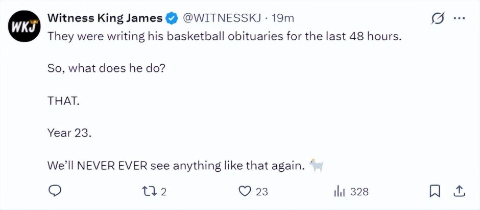 湖人媒体再度盛赞勒布朗是关键时刻的国王,GOAT。