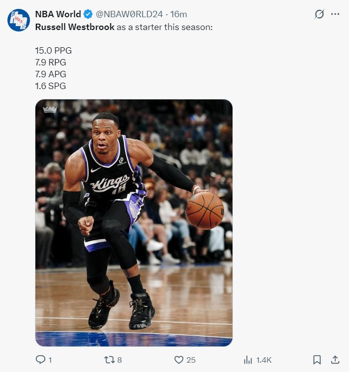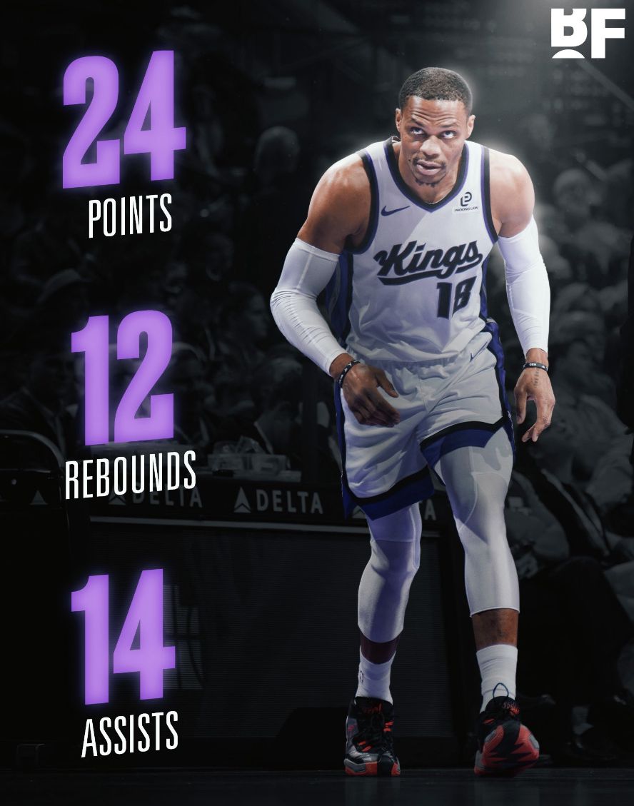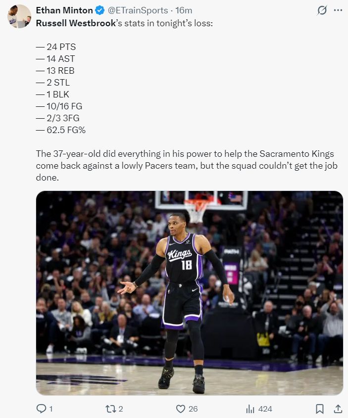 国王记者晒出威少的数据致谢道:这位 37 岁的老将竭尽全力帮助萨克拉门托国王队。