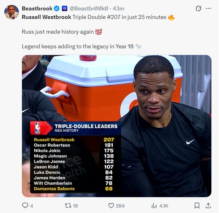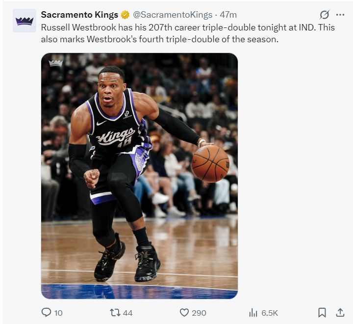 国王队官方也晒出推文祝贺拉塞尔-威斯布鲁克完成自己新的生涯里程碑。