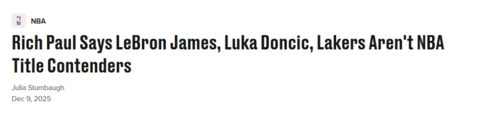 保罗认为,在詹姆斯可能的生涯最后一个赛季,湖人尚未具备冲击总冠军的实力。在节目上,保罗表示,他个人并不“认为湖人如今的阵容足以成为争冠球队”。“我觉得他们的配置还够不着西部决赛的门槛,从争冠的角度来讲,他们的硬实力还远远不够。”