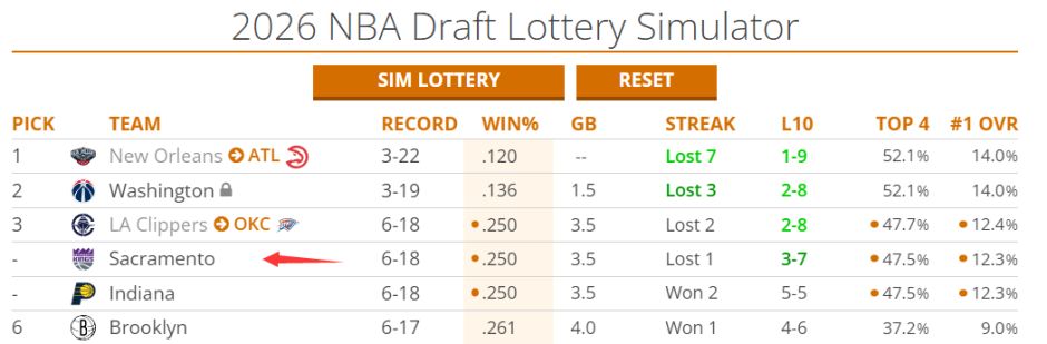 实际上国王6胜18负战绩是联盟倒数第三,国王的状元签概率已经提升到12.3%,前四签概率高达47.5%。
