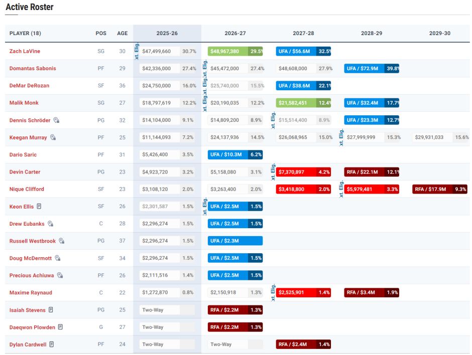 拉文还剩两年1.05亿,小萨还剩三年1.356亿,德罗赞还剩两年4900万,蒙克还剩三年6000万,埃利斯还剩一年230万,施罗德还剩三年4500万,这些球员都可能在12月15日开放交易后被送走,拉文、德罗赞大概率都是负资产了,小萨应该还可以换回一些年轻资产。
