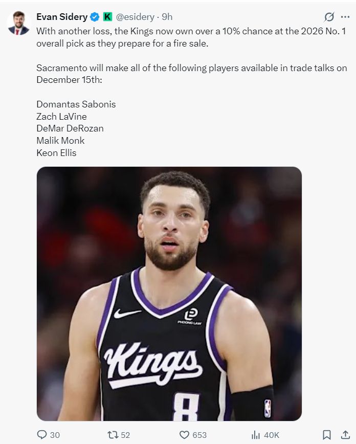 根据NBA记者埃文-斯迪瑞的报道,国王队在2026年状元签的概率已经超过了10%,他们正在酝酿超大规模的交易,在交易开放日12月15日后,小萨博尼斯、拉文、德罗赞、蒙克、埃利斯都在交易名单上。