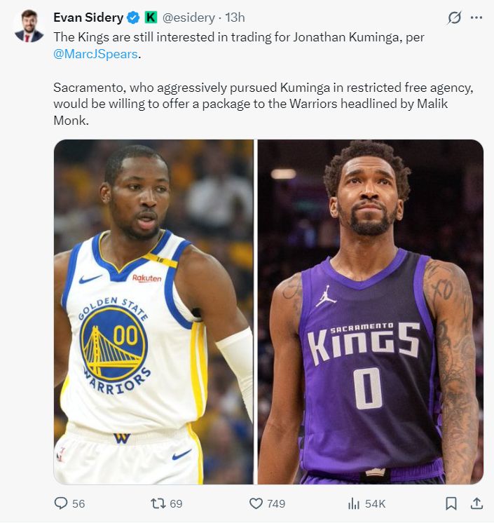 埃文-斯迪瑞还透露,萨克门托国王依旧对勇士前锋乔纳森-库明加感兴趣,国王队将继续追逐库明加,他们愿意为勇士队提供一个包含马利克-蒙克在内的完整交易方案。换言之这只是国王队交易的第一步,因为队内还有多个需要交易的筹码。