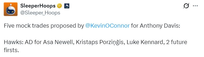 根据凯文-奥康纳的说法,老鹰交易得到安东尼-戴维斯的筹码可能是:波尔津吉斯、肯纳德、2个未来的首轮签。