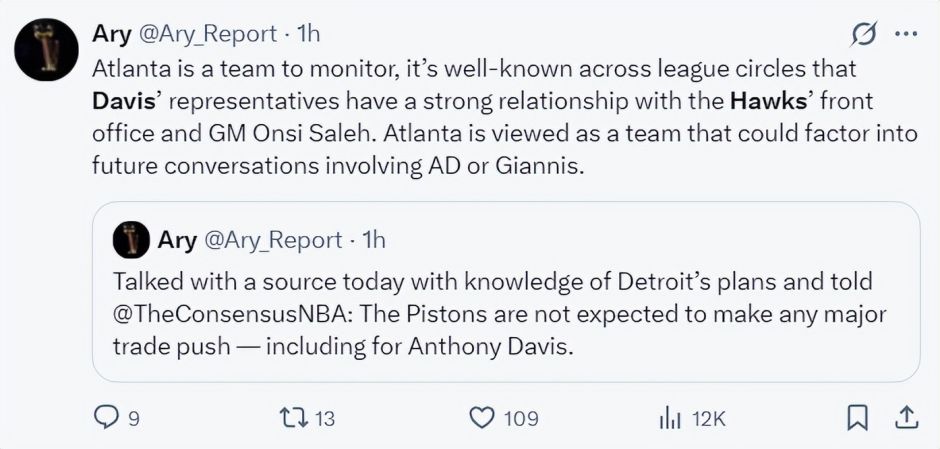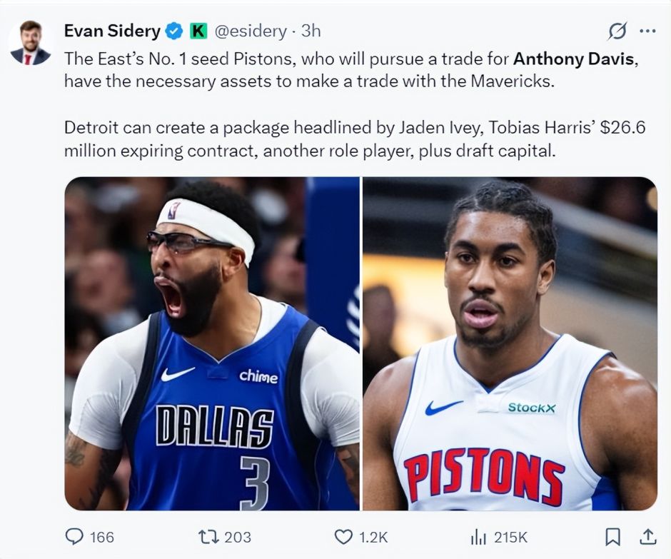 根据NBA记者埃文-斯迪瑞的报道,活塞队作为东部第一,他们希望交易得到安东尼-戴维斯继续提升综合实力,他们可以打包艾维、哈里斯2660万的到期合同、一个角色球员、选秀权为筹码。