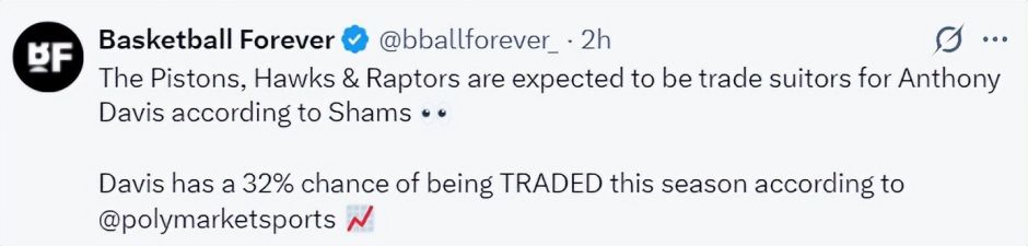 根据数据媒体Polymarket的分析,安东尼-戴维斯本赛季在交易截止日前被送走的概率为32%,目前戴维斯的经纪人里奇-保罗已经跟独行侠管理层进行会面,双方会协商是交易还是续约,独行侠并没有关闭继续合作的窗口。