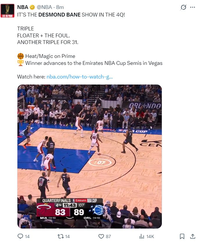 第三节的贝恩也很出色,单节7中4+三分2中2拿到10分2篮板1助攻,但他最高光的还是末节开场,他末节开场2分钟里连拿9分,就连NBA官方都为贝恩唱赞歌。