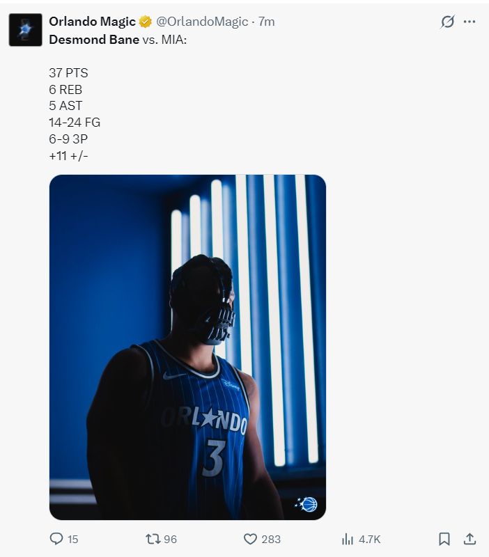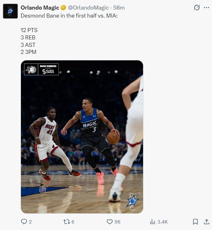 贝恩也完成了他魔术生涯首次单场命中5+三分球,实际上贝恩全场比赛命中了6个三分球。