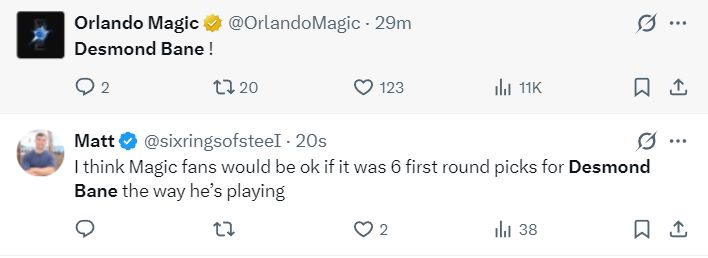 魔术记者马特调侃:我觉得魔术队球迷应该能接受用六个首轮选秀权去换德斯蒙德-贝恩,他现在打球这个状态超值啊。