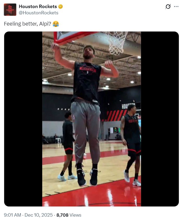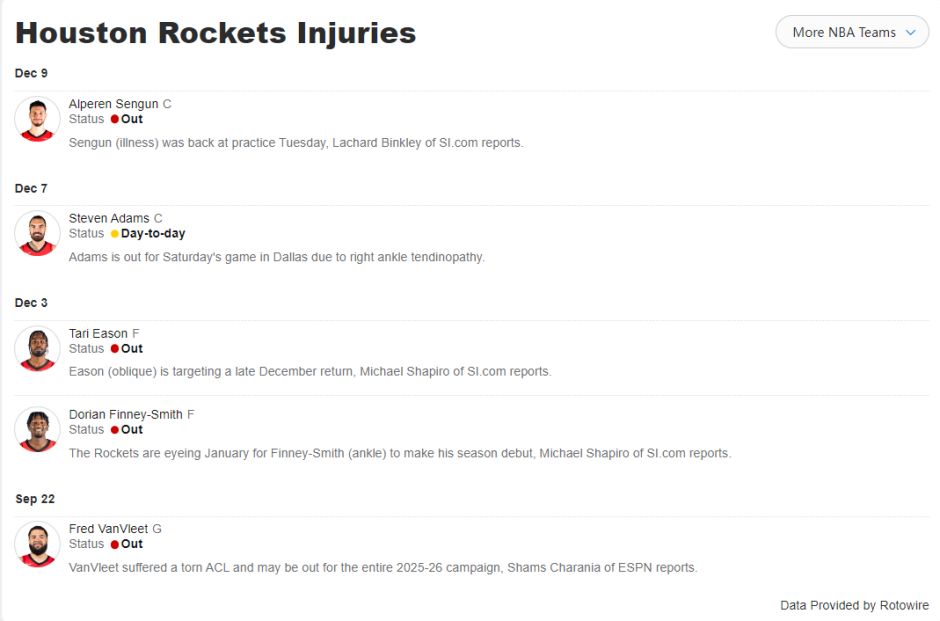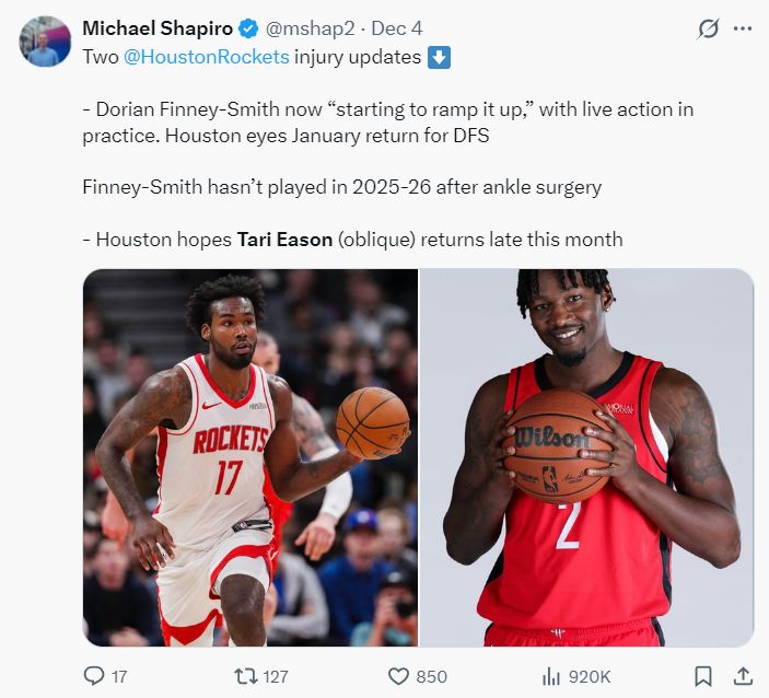此前根据NBA记者迈克尔-夏普瑞的报道,伊森至少要12月中旬才能复出,芬尼-史密斯最早要在2026年1月才会复出,所以火箭队阵容齐整太难了。