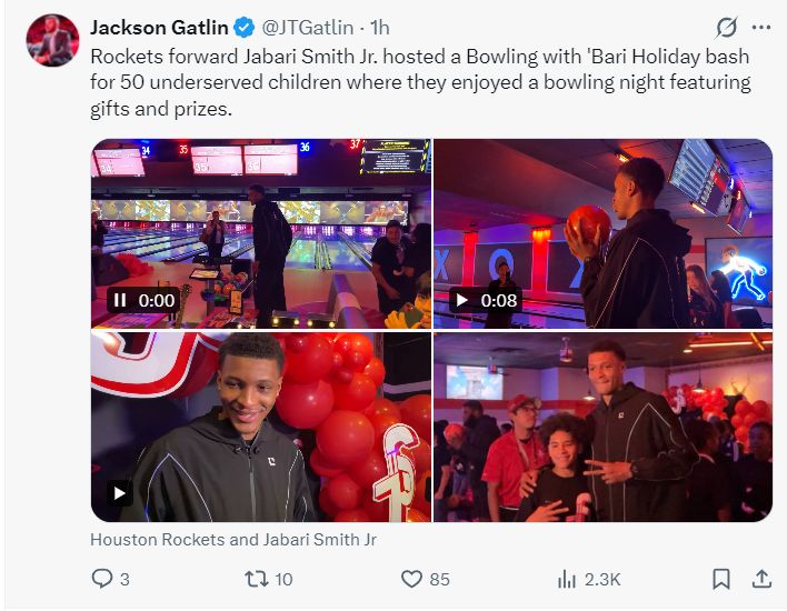 训练结束后,小贾巴里-史密斯、霍勒迪两人参与了社区活动,这两人跟50位孩子进行了一场保龄球比赛,期间小贾跟多位小球迷进行合影。