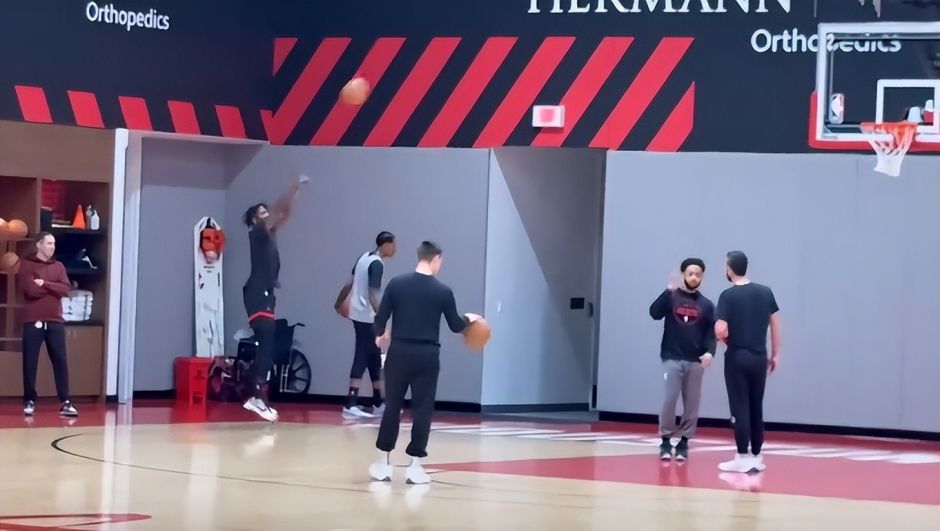 申京在12月10日的训练中已经完成了所有的训练项目,在5V5对抗训练后,他个人还加练了1V1的背身单打训练,火箭官方还晒出他训练结束后高高跃起想要头撞篮板结果还差一大截。