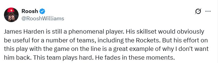 休城记者Roosh Williams也在社媒上谈到此事。”詹姆斯-哈登依旧是一名极具天赋的球员。他的技术能力显然能为多支球队提供助力,火箭队也不例外。但在这场比赛的生死时刻,他在那个关键回合里的拼劲,恰恰印证了我为什么不希望他回归 —— 这支火箭队的球员个个全力以赴、奋勇拼搏,而他却在这样的紧要关头总是掉链子。”