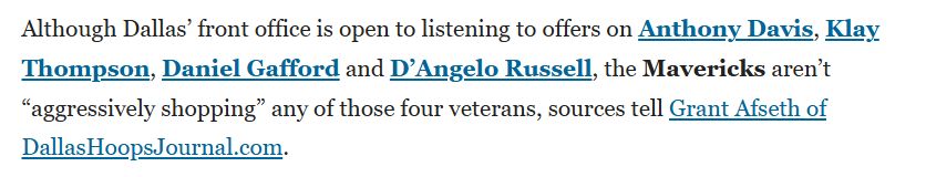 北京时间12月13日,据独行侠队记Afseth报道,独行侠管理层愿意听取关于安东尼-戴维斯、克莱-汤普森、丹尼尔-加福德以及德安吉洛-拉塞尔的报价,但球队目前并未在积极兜售这四位老将中的任何一人。